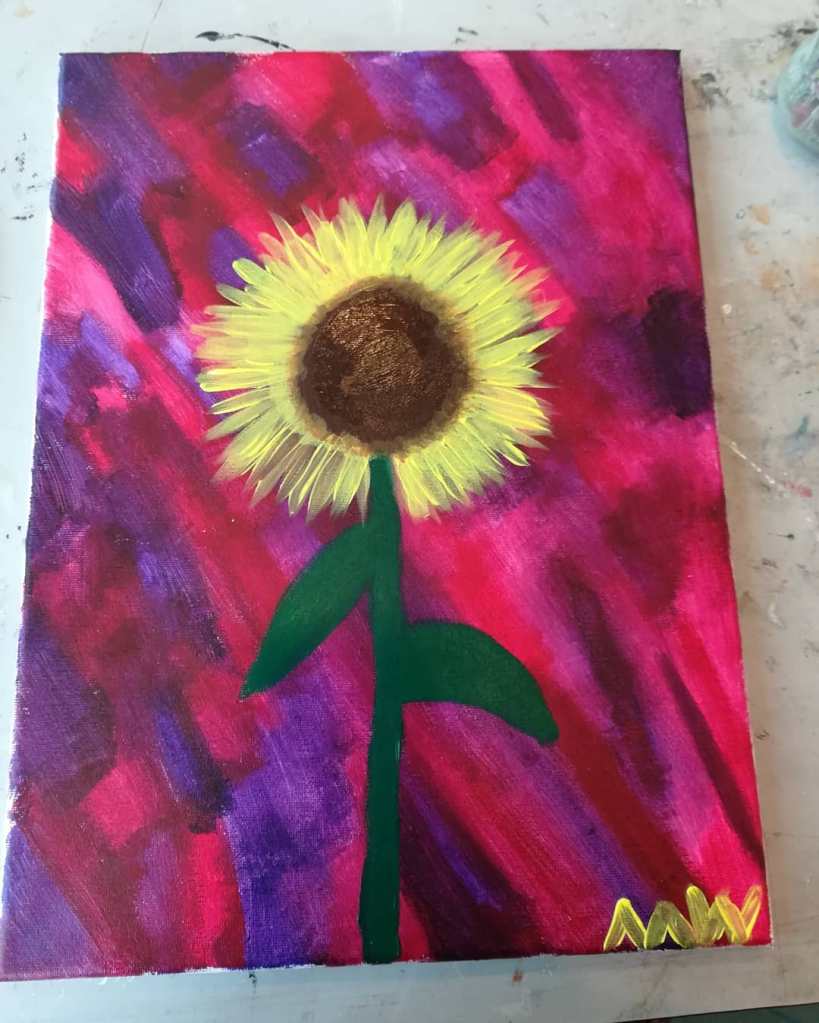 ik schilder wel eens op dagbesteding, het is ontspannend om met verf bezig te zijn. Druk om echt iets moois te maken voel ik al een tijd niet meer, heb omarmd dat ik er niet goed in ben en vertel dat ieder die het wil weten en wellicht een paar die het niet wilden weten.